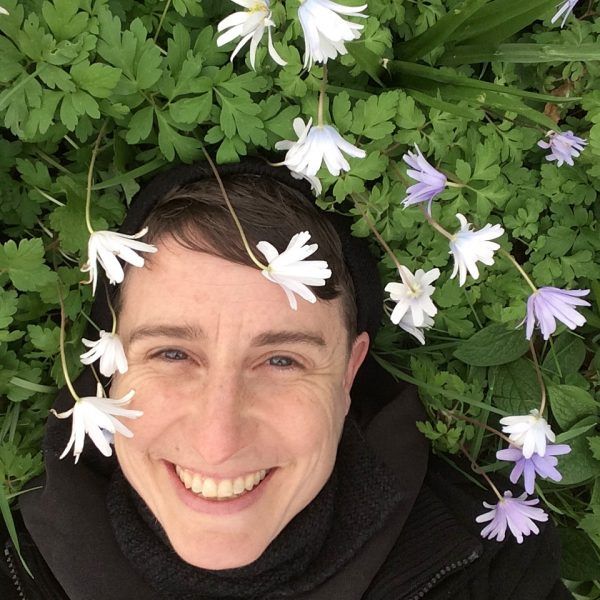 Coral Short, a nonbinary person with light skin and short dark hair, is lying on a bed of green leaves and flowers. They are smiling brightly at the camera, surrounded by small white and light purple flowers.