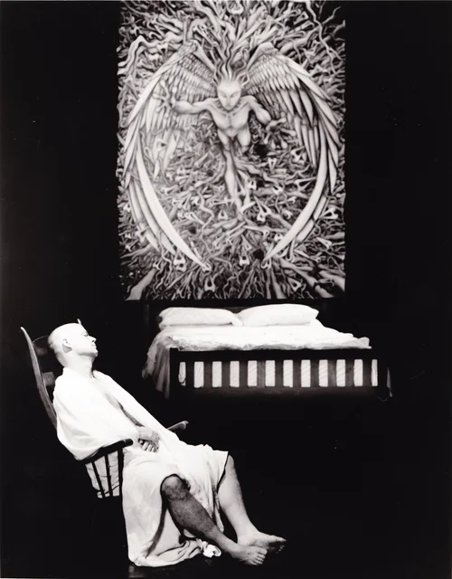 Black and white image of a pale male figure in a dark bare room. The person is wearing