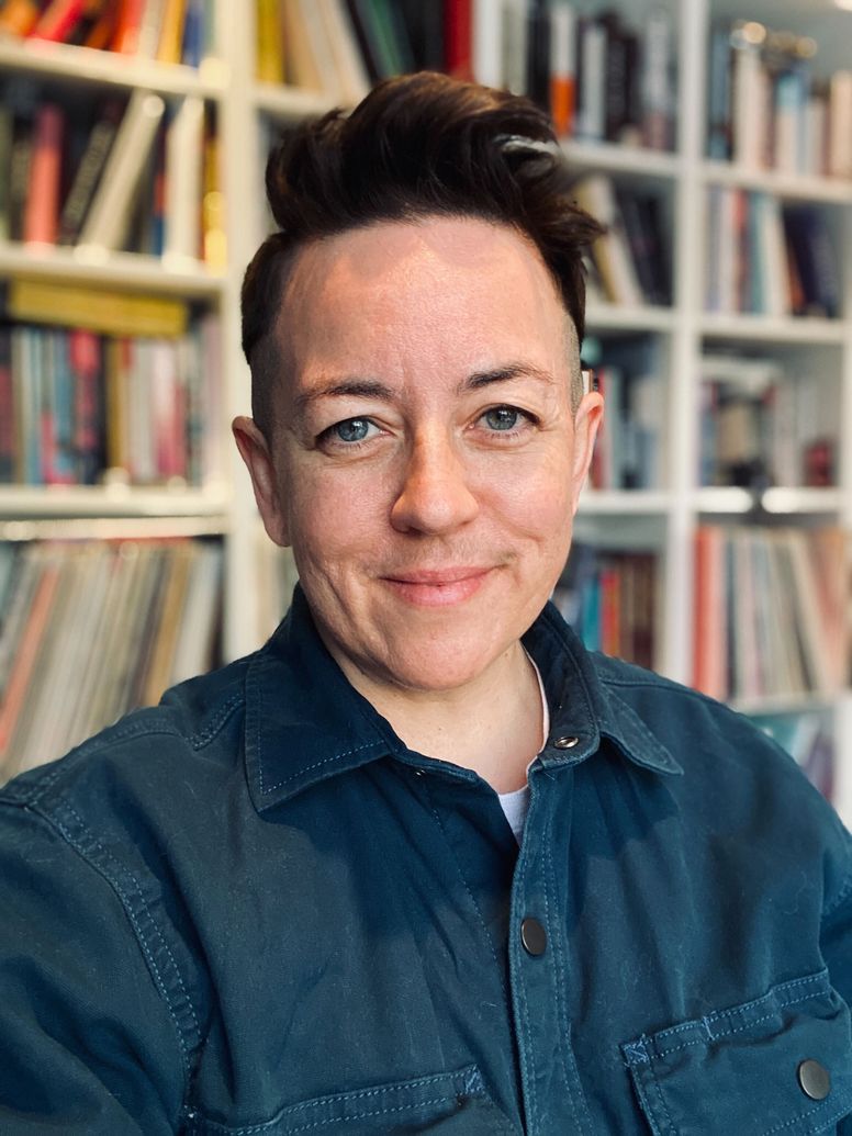 Evie Johnny has light skin and brown hair cropped short on the sides. They wear a button-up blue shirt. They are smiling in front of a colourful, out-of-focus bookcase.