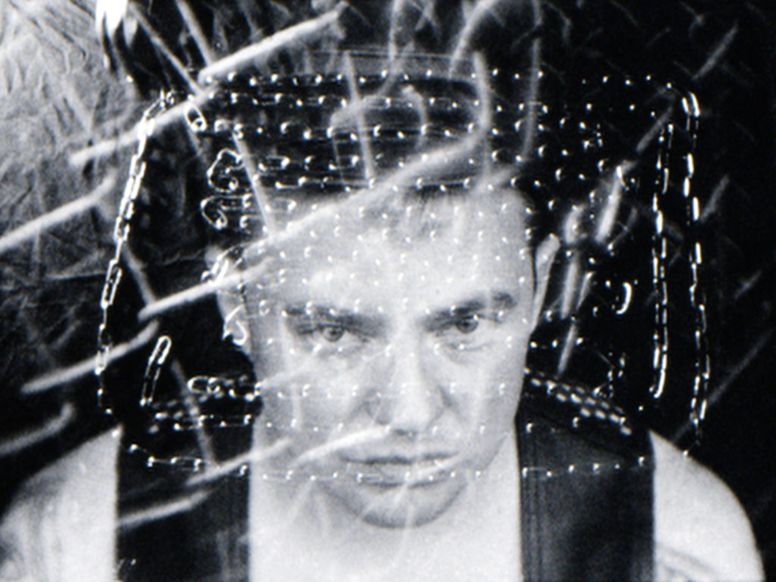 A creative self-portrait taken by Malic Amalya. Malic Amalya has fair skin, short dark hair, and is wearing a black tank top. They look towards the camera pointed above with their eyes only, posing with a serious and focused expression. The image is a black-and-white photograph with a surreal and intense atmosphere created by eerie lighting, the dark background, superimposed metallic chain elements and abstract fragmented patterns overtop the portrait.