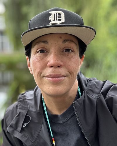 Raven looks directly at the camera with a slight smile and warm eyes. They have brown eyes and freckles. They have short black hair and are wearing a black ballcap with a stylized D. They also wear a back raincoat and a thin necklace with turqouise, black, red, yellow and white beads.